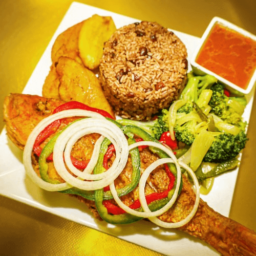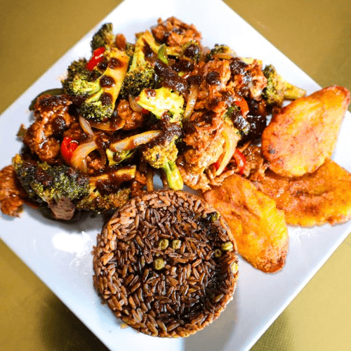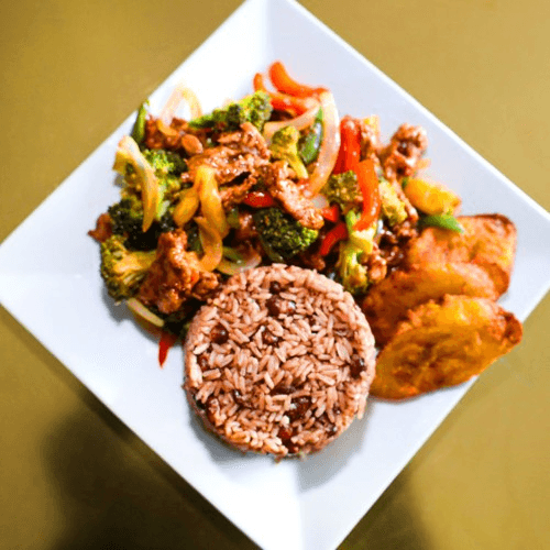 Ginger chik'n, broccoli, red and green peppers, onions, served with rice of choice and plantains.