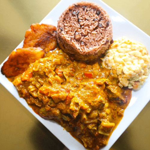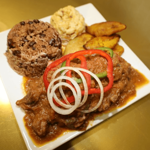 Tender stewed turkey simmered in a rich, aromatic Haitian Creole sauce, bursting with bold island spices, served with your choice of two signature sides.