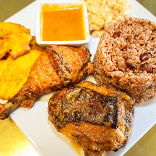 Served with rice, green plantains, black bean stew, mac & cheese topped with chopped jerk chicken