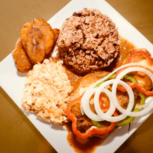 Jamaican style served with rice and peas, sweet fried plantains, and creamy macaroni and cheese.