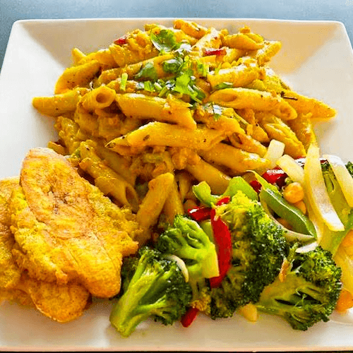 Delight in our Ethno Rasta Pasta, tossed with vibrant vegetables and served with golden fried sweet plantains-a colorful, Caribbean-inspired feast.