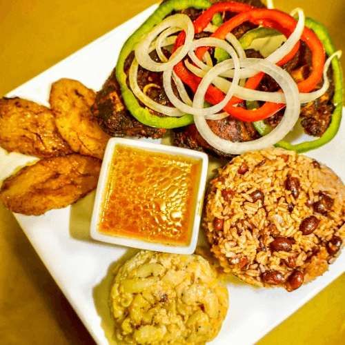 Marinated in bold Haitian spices and fried to golden perfection, served and sweet fried plantains or pikliz vegetable relish.