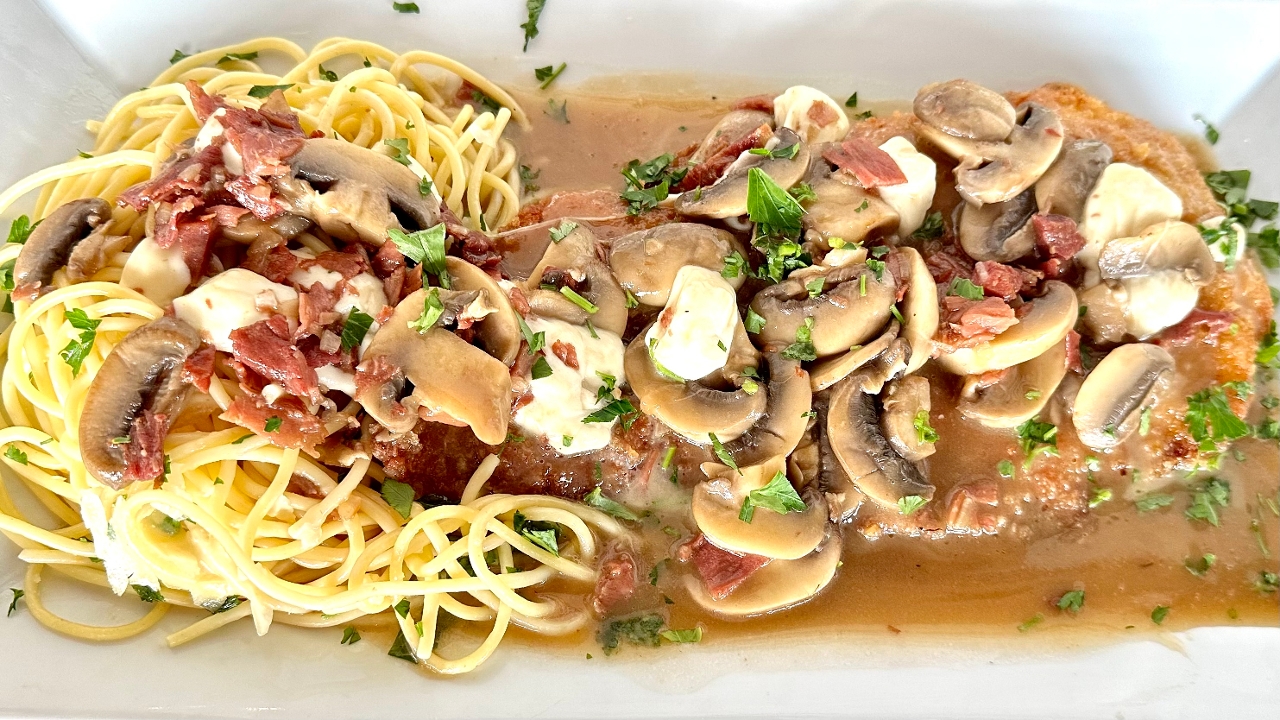 Chicken Cutlet, Prosciutto, Mushrooms, Marsala Wine Sauce, Fresh Mozzarella Side Spaghetti OR Penne